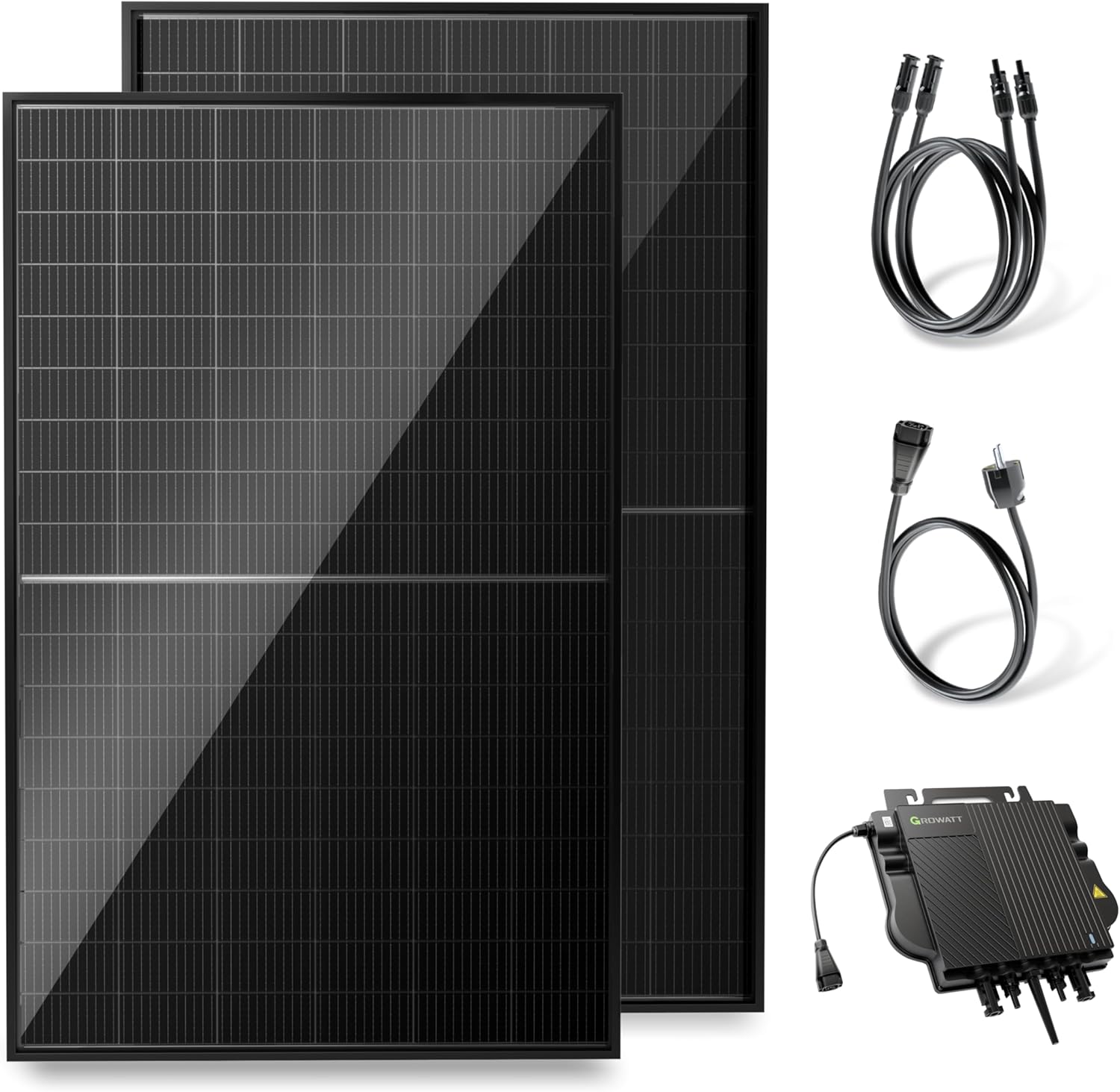 Aufseiten des Wechselrichters erwartet Käufer ein Modell von Growatt mit einer Ausgabeleistung von 800 Watt, was genau der Bagatellgrenze für den genehmigungsfreien Betrieb entspricht. Zum Lieferumfang gehören außerdem ein Anschlusskabel mit Schuko-Stecker und zwei 2 Meter lange Verlängerungskabel für die Solarmodule.