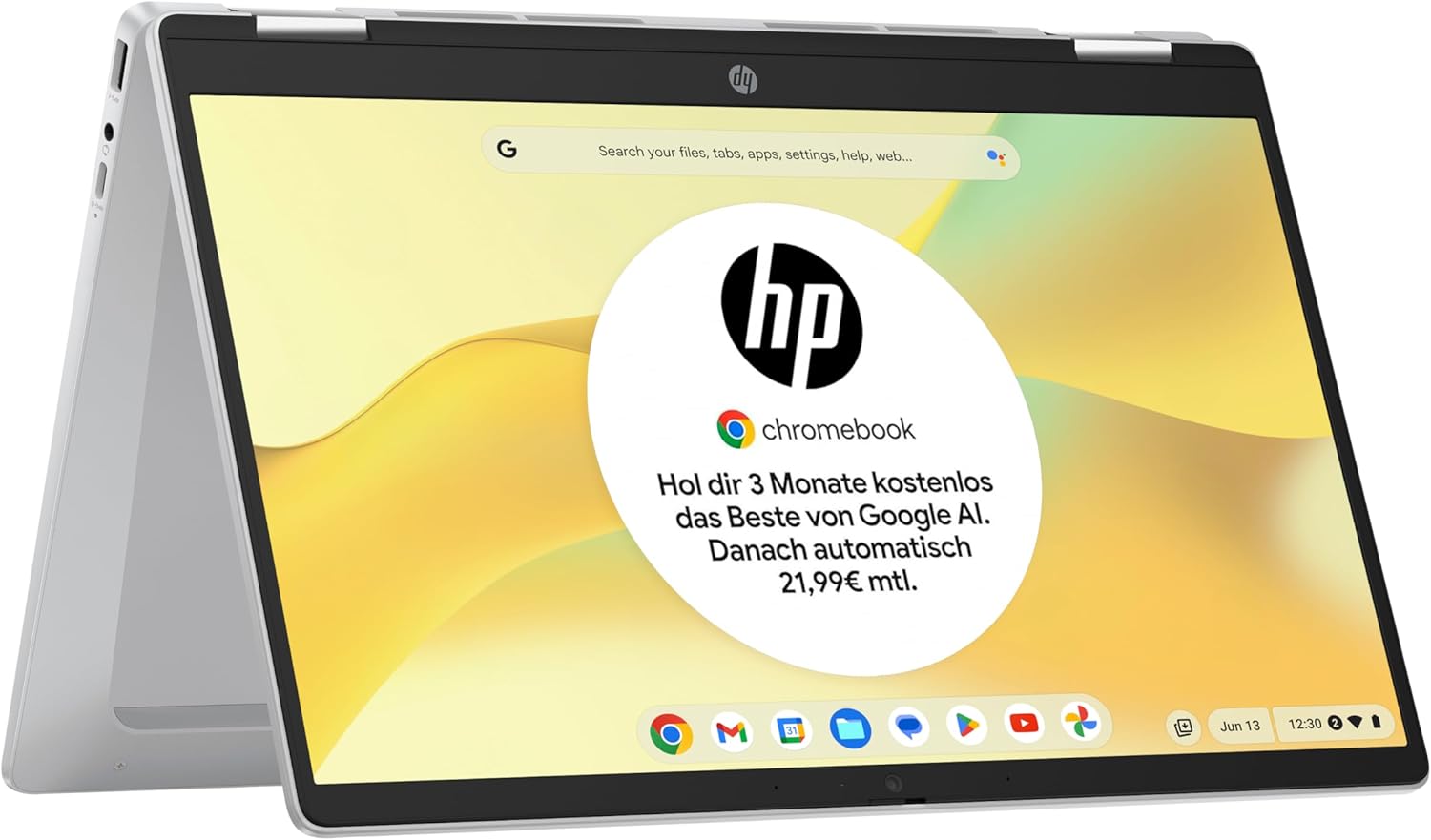 Das Convertible soll laut Herstellerangaben außerdem durch einen 14-Zoll-Touchscreen überzeugen, der eine intuitive Bedienung per Wisch- und Tippbewegungen ermöglichen soll. Das Full-HD-Display im 16:9-Format soll dabei für eine klare und übersichtliche Darstellung sorgen, ohne ständiges Scrollen. Mit integriertem ChromeOS soll das Gerät eine einfache Handhabung bieten und zusätzlich mit einem vorinstallierten Virenschutz ausgestattet sein.