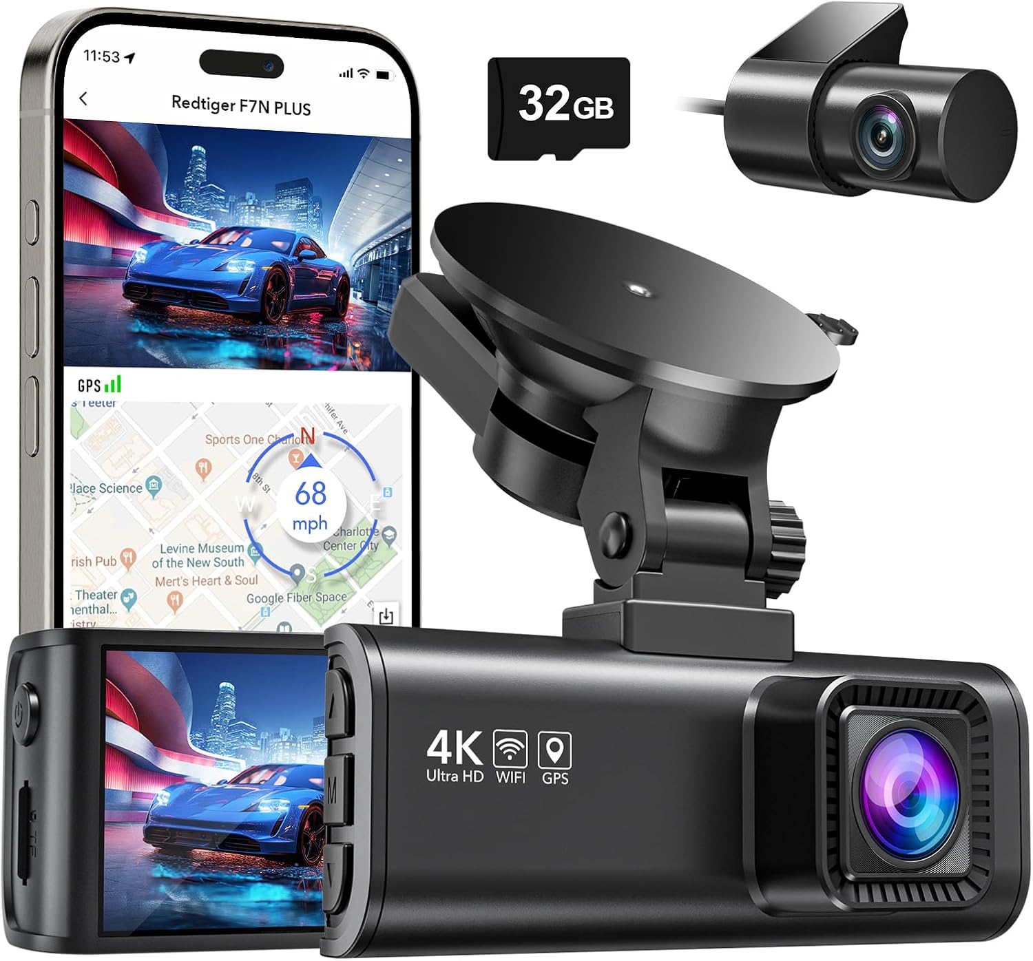 REDTIGER Dashcam Auto Vorne Hinten 4K/2,5K mit GPS WiFi, Dash Cam Auto Kamera 3,18" IPS-Bildschirm, kostenlose 32-GB-Karte, Nachtsicht, Loop-Aufnahme, 170°Weitwinkel WDR, Unterstützt 256 GB Max(F7NP)