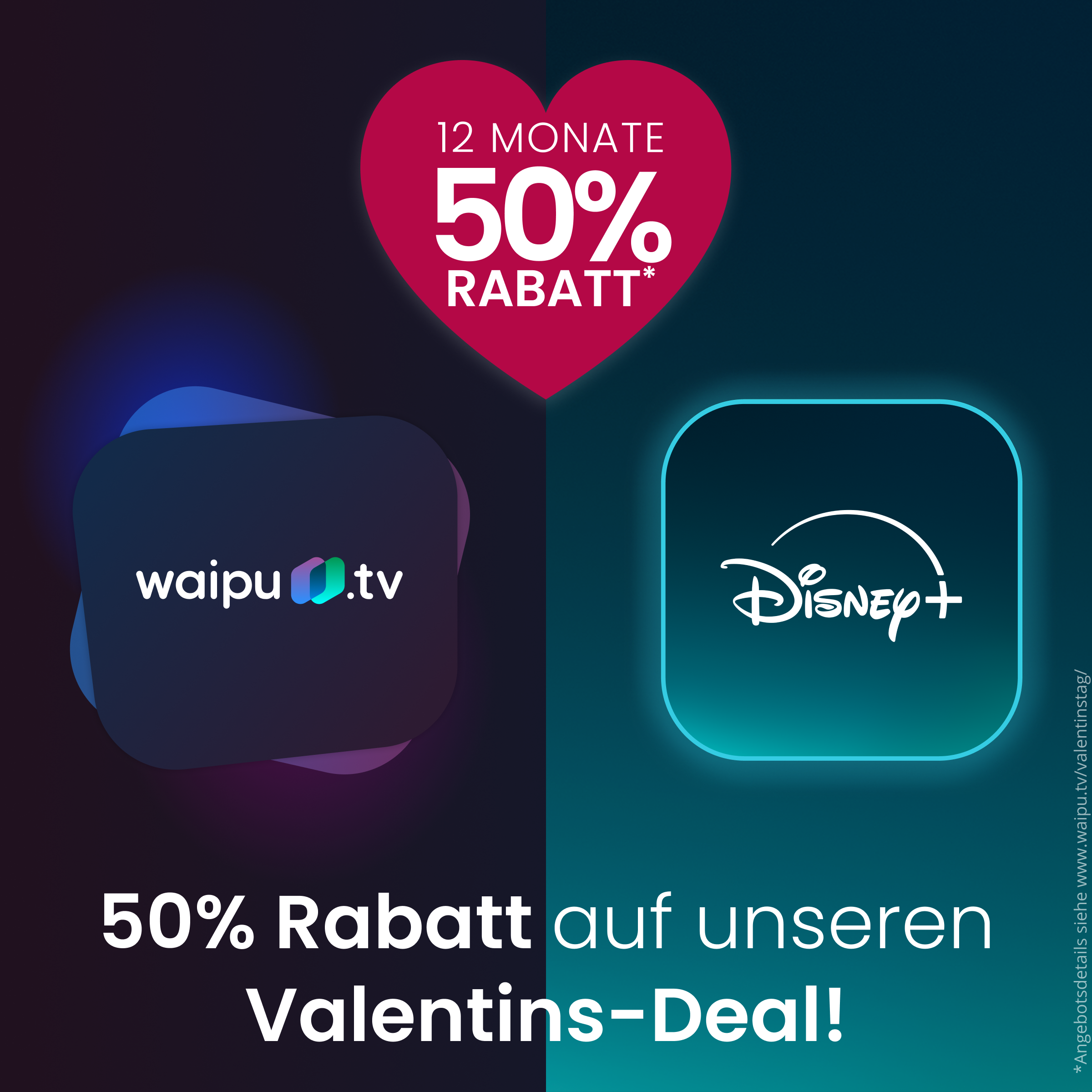 Wer die perfekte Kombination aus TV und Streaming sucht, freut sich über den Valentins-Deal bei waipu.tv. Der Internet-TV-Dienst kombiniert sein Angebot mit dem Streamingdienst Disney+ und schnürt so ein Entertainment-Paket, das keine Wünsche offenlässt. Zum Valentinstag bietet waipu.tv das Bundle ein Jahr lang zum halben Preis an. Der Deal gilt allerdings nur noch bis zum 15. Februar. Daher sollten Interessenten nicht zu lange warten, da der Anbieter den Deal auch jederzeit vorzeitig beenden kann.