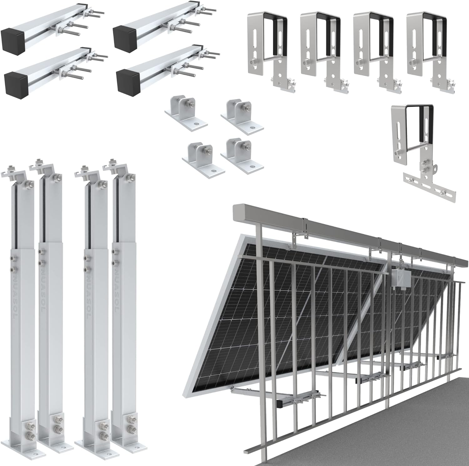 Die NuaFix-Halterung ermöglicht die Befestigung von ein oder zwei Solarmodulen sowie eines Wechselrichters an eckigen Balkongeländern mit einer maximalen Breite von 80 mm. Die Halterung bietet die Wahl zwischen einer festen 0°-Positionierung und einer einstellbaren Neigung von 25 bis 45°. Diese Flexibilität ist entscheidend, um den optimalen Winkel für die maximale Sonneneinstrahlung und somit die höchste Energieeffizienz zu erreichen. Die Halterung besteht laut Hersteller aus hochwertigem Edelstahl und AL6005-T5-Aluminium, was eine hohe Widerstandsfähigkeit gegen Wettereinflüsse und eine lange Lebensdauer verspricht. Trotz der laut Anhaben robusten Materialien ist bei der Montage darauf zu achten, dass die Halterung korrekt und sicher am Geländer befestigt wird, um eine optimale Funktion und Sicherheit zu gewährleisten. Die Verantwortung obliegt dem Anwender. Selbstredend ist auch zu prüfen, ob die Halterungen zu den jeweiligen Modulen und baulichen Gegebenheiten passen.