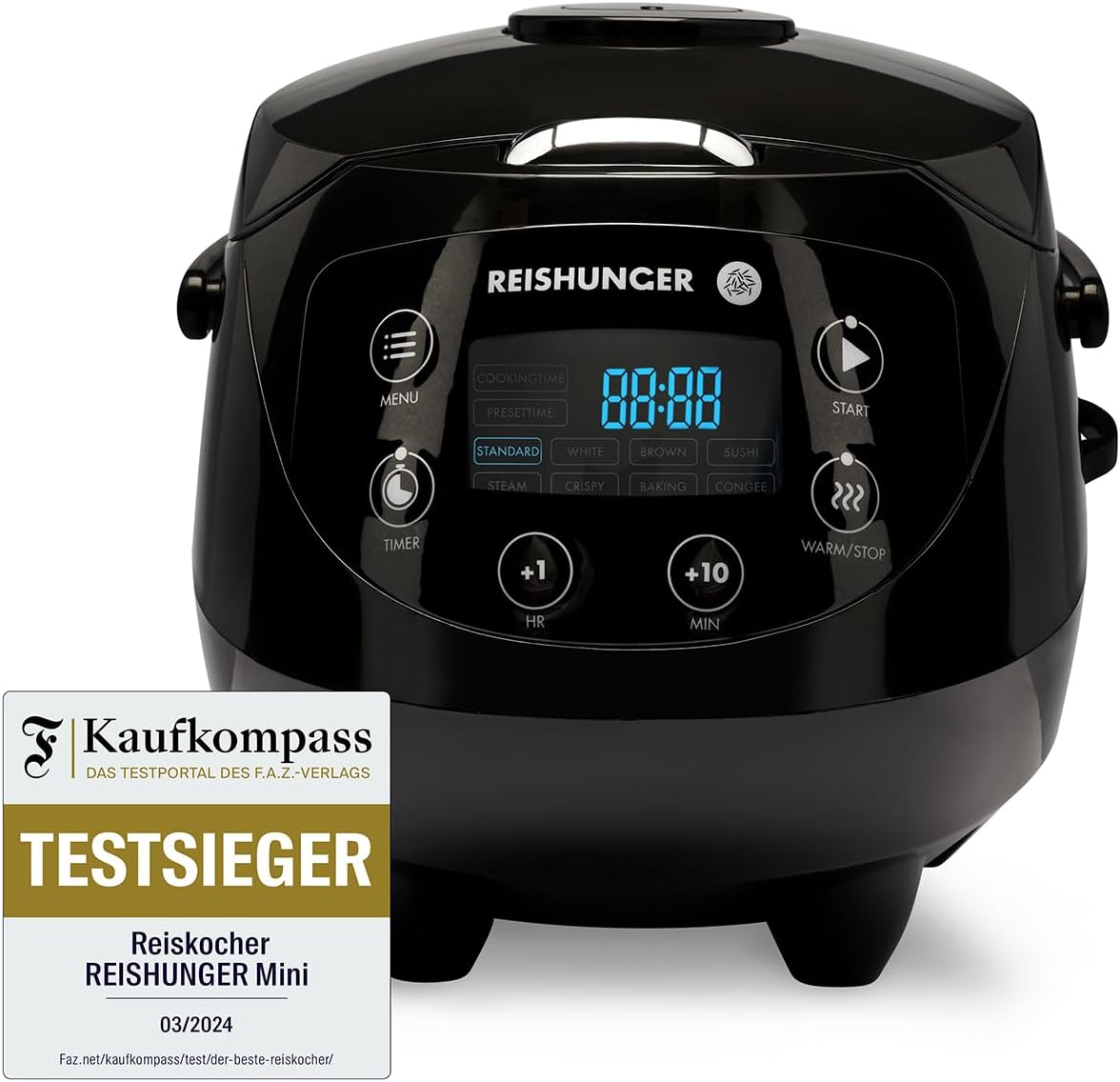 Zusätzlich verfügt der Reiskocher über acht verschiedene Programme, die neben der Zubereitung von Sushi-Reis und Tahdig auch das Kochen von Quinoa oder anderen Getreidesorten ermöglichen. Der Reiskocher kann außerdem als Dampfgarer verwendet werden, um Gemüse, Fisch oder Fleisch schonend zuzubereiten. Sogar das Backen von Kuchen ist mit diesem Gerät möglich. Die vielseitige Nutzung macht den Reishunger Reiskocher zu einem echten Multitalent in der Küche.