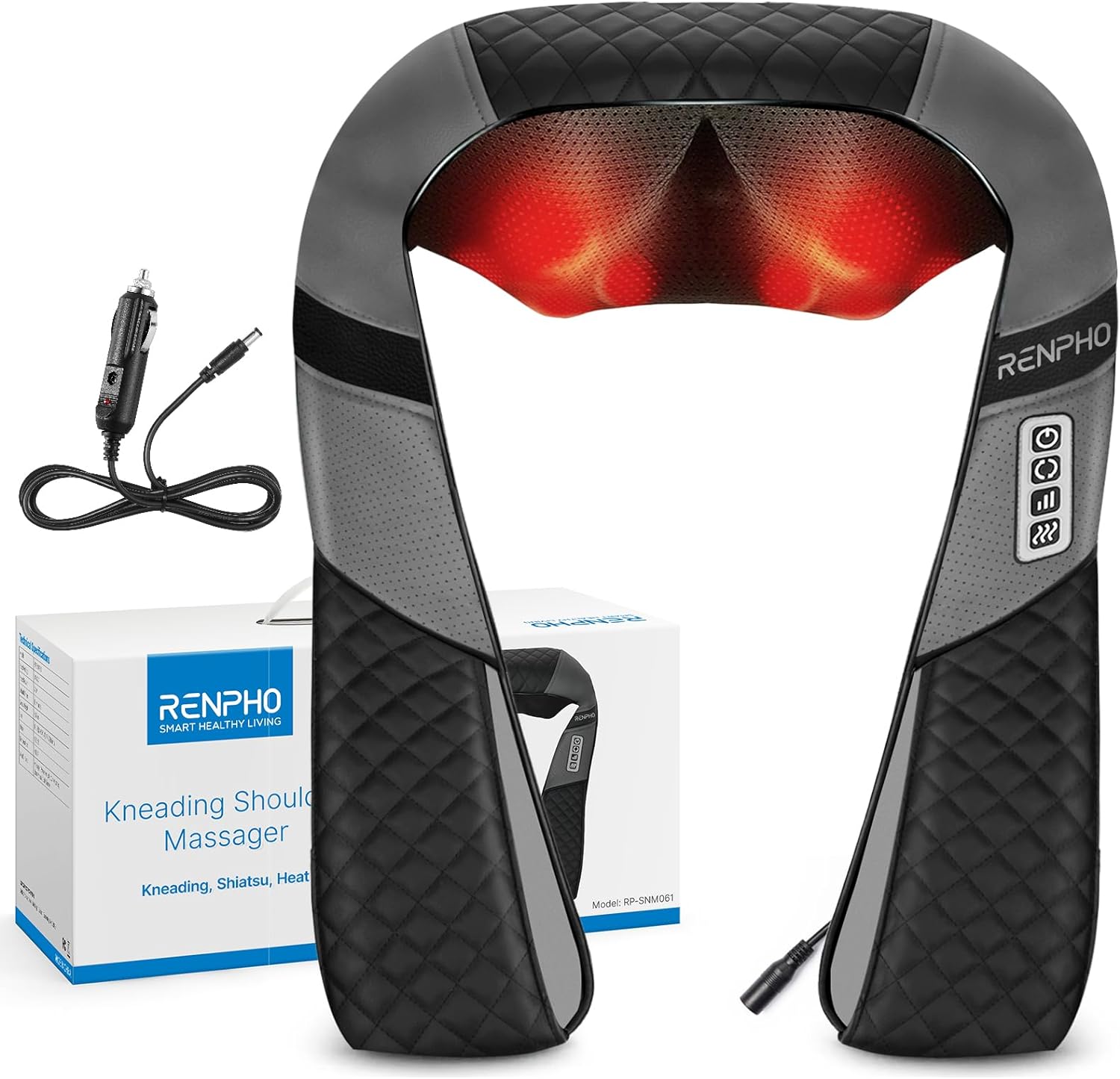 Betrieben wird das Nackenmassagegerät von Renpho über einen Stromanschluss. Ein 2,5 Meter langes Kabel ist ebenso im Lieferumfang enthalten wie ein AC-Adapter (100 bis 240 V) und ein Autoadapter (12 V), so dass man seine Massage sowohl zu Hause als auch unterwegs genießen kann.