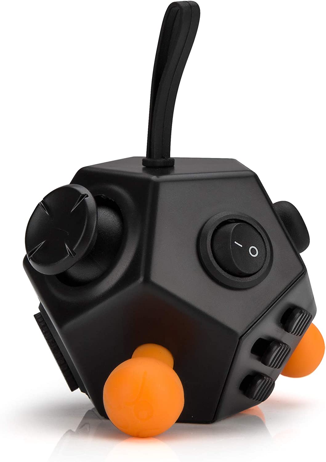 Wer etwas zur Beschäftigung der Hand braucht, kann sich eines Fidget Cubes bedienen. Dieser kleine Plastikwürfel (oder gerne auch regelmäßige Pentagondodekaeder) bietet auf jeder Fläche eine kleine Beschäftigung (Zahnräder, Klicker, Kippschalter etc.).