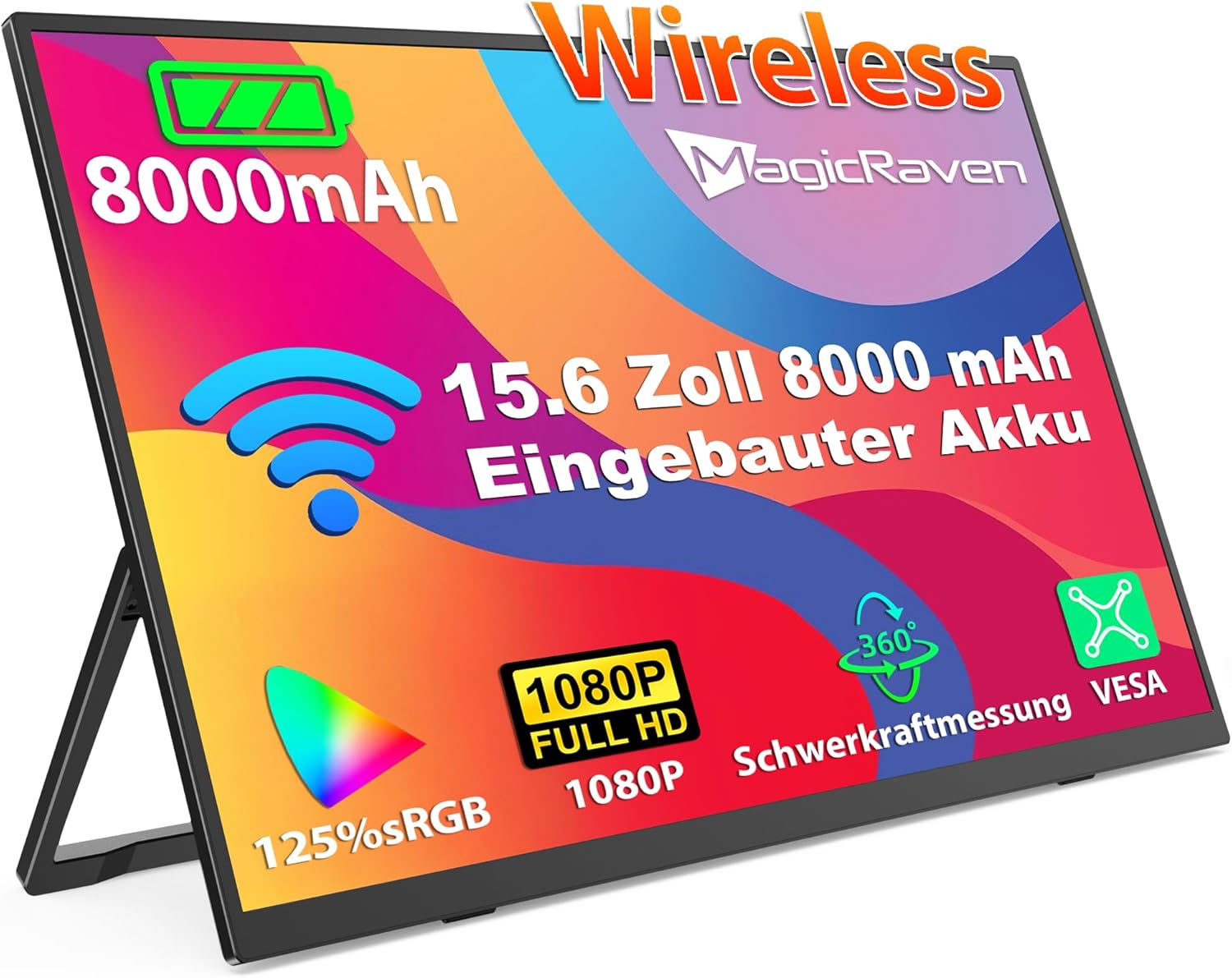 Drahtloser Portable Monitor mit 8000-mAh Akku, 15,6 Zoll 1080P Tragbarer Monitor, Laptop Bildschirm Erweiterung, Mobiler Monitor IPS Screen, Unterstützt AirPlay/Miracast,für Laptop/Telefone