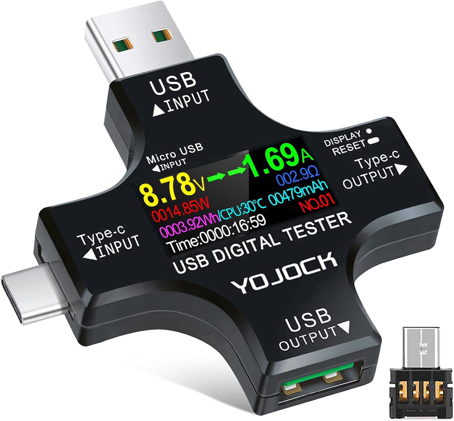 Der USB-Tester von Yojock verfügt sowohl über USB-A- als auch USB-C-Ein- und Ausgänge und ist dadurch mit einer Vielzahl von Geräten kompatibel. Er wird zwischen einer Stromquelle und einem Endgerät angeschlossen und misst neben Strom, Spannung und Energie auch Werte wie den Widerstand, die Arbeitstemperatur oder die Akkukapazität. Dadurch lassen sich verschiedene Optionen miteinander vergleichen, untaugliches Zubehör identifizieren und die beste Option wählen. Auch Schnellladeprotokolle wie PD 3.0 oder QC 3.0 werden dabei unterstützt.