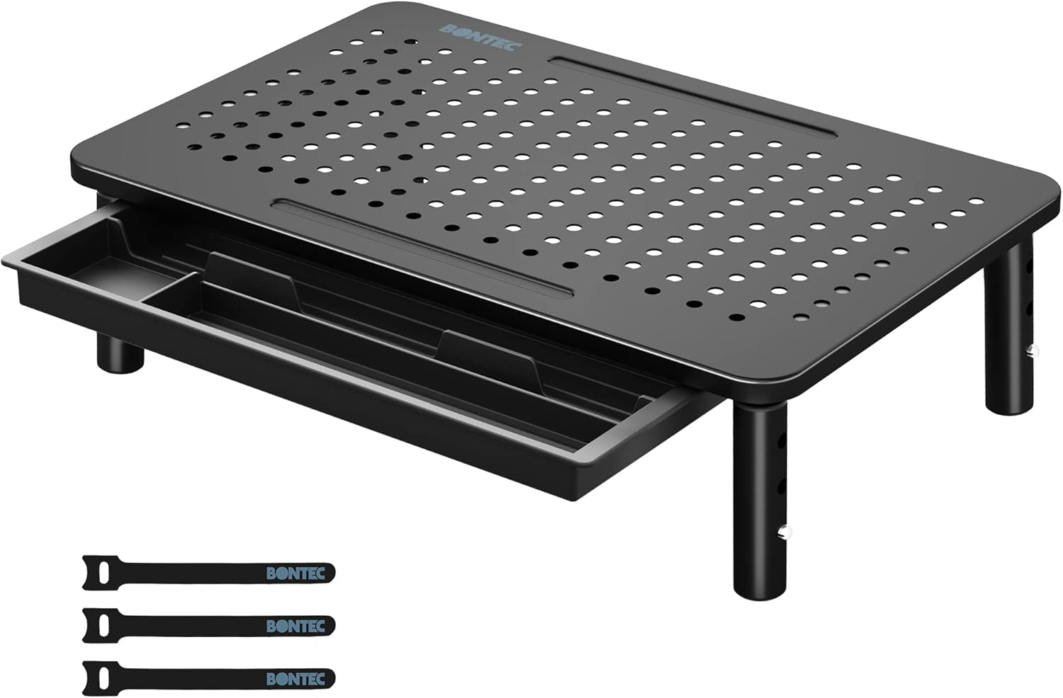 Der Monitorständer von Bontec besteht aus robustem, pulverbeschichtetem Stahl und trägt eine Last von bis zu 20 Kilogramm. Damit eignet er sich nicht nur für Monitore unterschiedlicher Größe, sondern auch für Laptops, All-in-One-PCs, Drucker und weitere Bürogeräte. Seine Oberfläche misst 368 x 231 Millimeter und besteht aus einer gelochten Metallplatte, die die Luftzirkulation unterstützt und durch eine effiziente Wärmeableitung eine Überhitzung der Geräte verhindert.