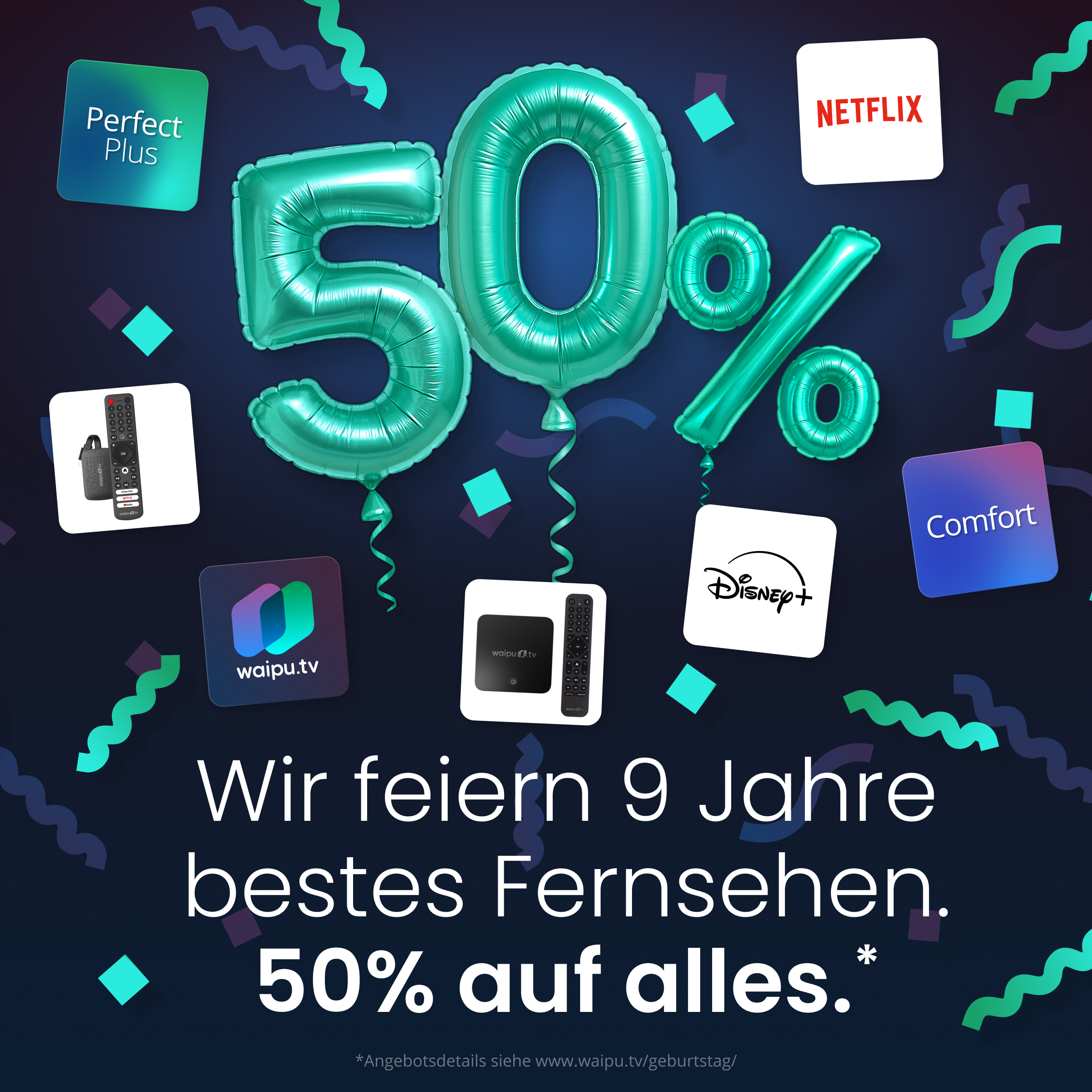 Der TV-Streamingdienst waipu.tv feiert seinen neunten Geburtstag und gewährt 50 Prozent Rabatt auf diverse Pakete. Die Sonderkonditionen gelten nach Abschluss für ein Jahr. Der Clou ist, dass nicht nur Neukunden von den reduzierten Preisen profitieren, sondern auch Bestandskunden. Durch die günstigen Angebote ist waipu.tv ab 3,74 Euro im Monat zu empfangen. Außerdem sind auch Pakete mit Disney+ oder Netflix zum halben Preis ab 1,50 Euro Aufpreis verfügbar.