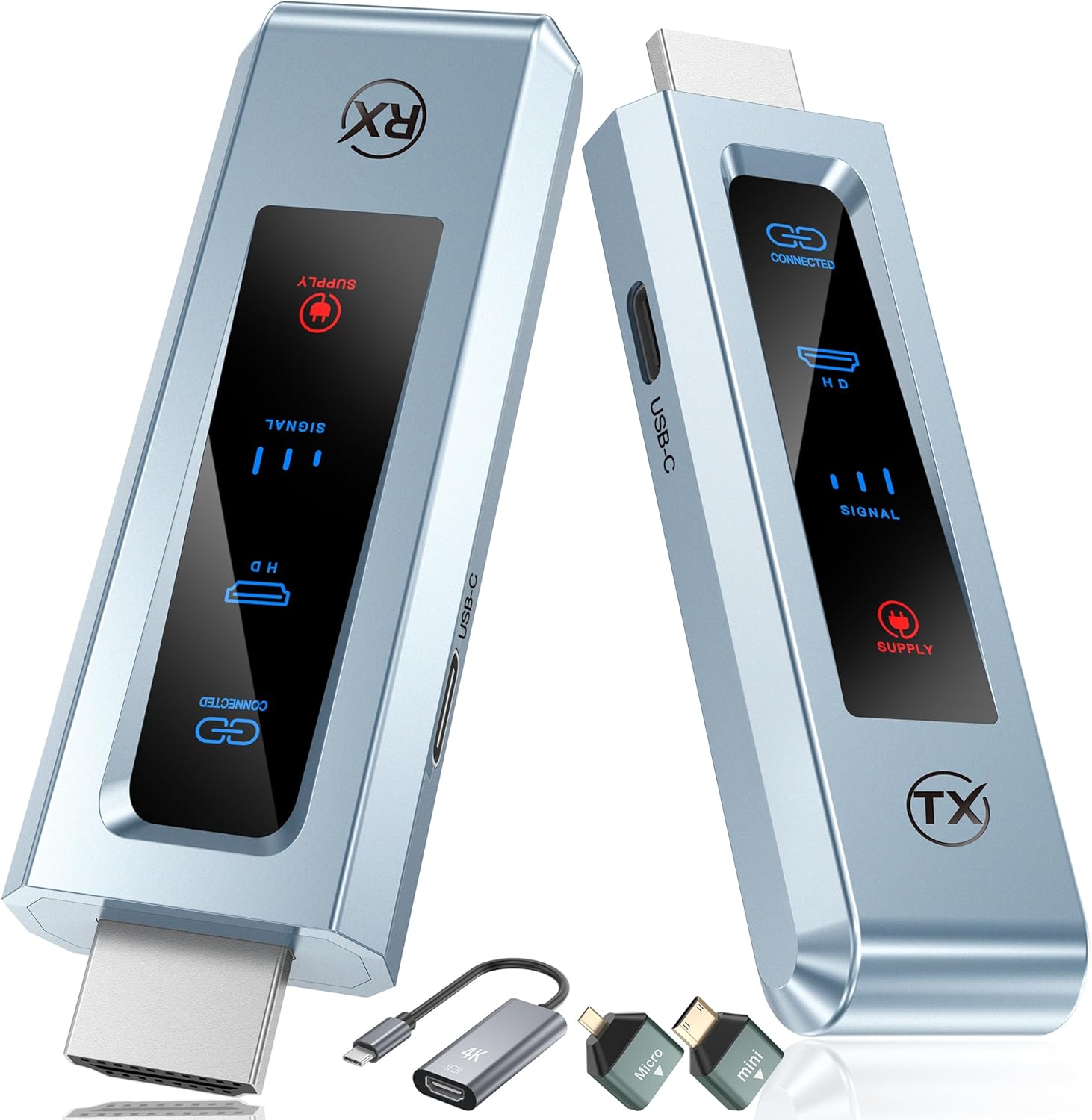 Dank der mitgelieferten Mini- und Micro-HDMI-Adapter lässt sich der HDMI-Transmitter unter anderem auch mit Digitalkameras verbinden. Für Smartphones oder Tablets wird ein separat erhältliches HDMI-auf-USB-C-Kabel benötigt.