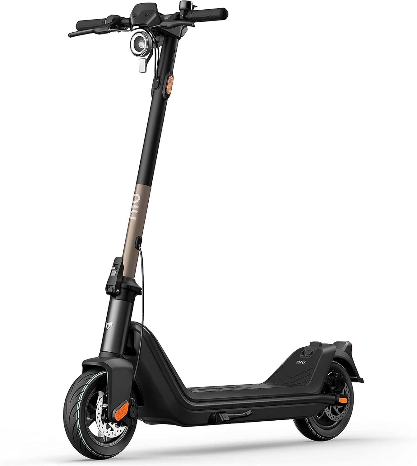 Zur weiteren Sicherheitsausstattung zählen eine helle Frontleuchte, ein Bremslicht, Reflektoren und eine mechanische Klingel. Blinker sind nicht vorhanden. Auch auf eine Federung wurde beim Niu KQi3 Pro verzichtet, die Dämpfung erfolgt allein über die Luftreifen.