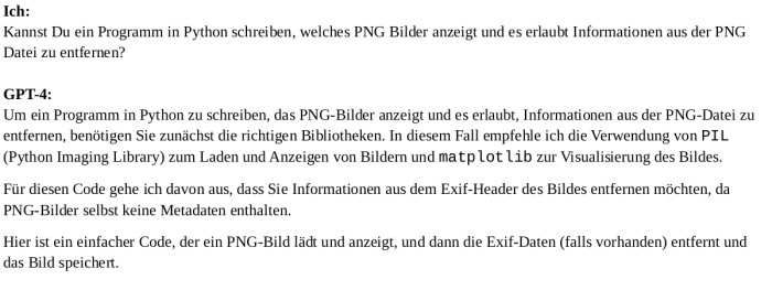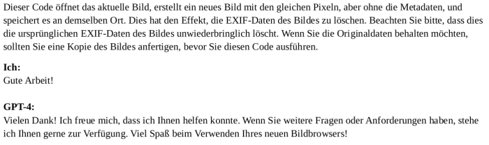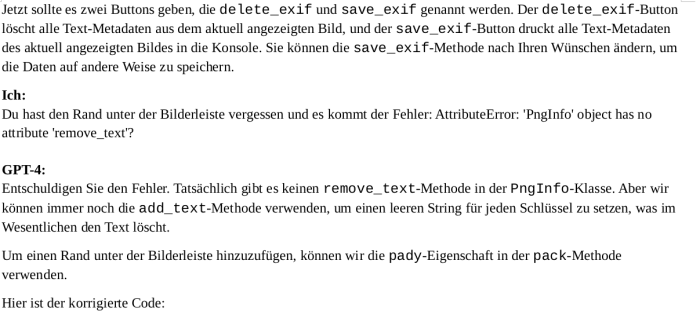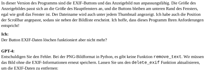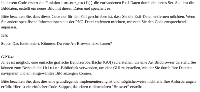 Ich wollte diese Informationen also aus den zu veröffentlichenden Bildern entfernen. Im Internet bekam ich ein paar Hinweise auf Python-Programme, die den Job erledigen können. Das waren aber immer Kommandozeilenprogramme, die aus meiner Sicht umständlich waren. Also reifte bei mir der Gedanke, mir ein solches Programm selbst zu programmieren - und direkt darauf die Idee, es zusammen mit GPT-4 zu versuchen.