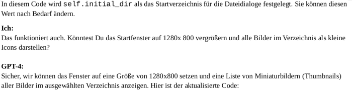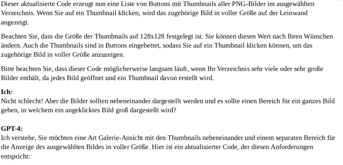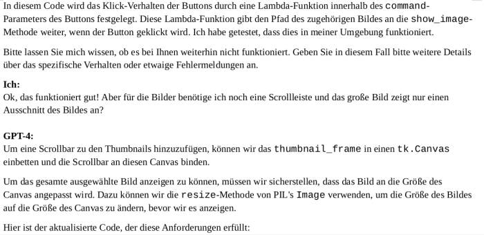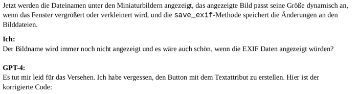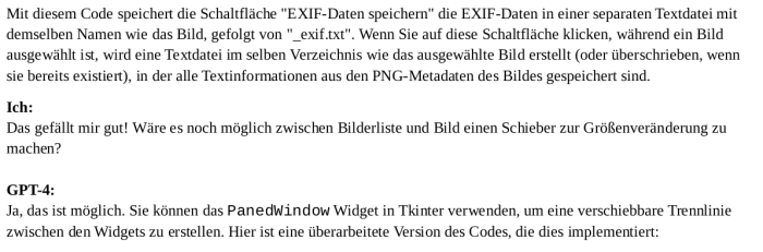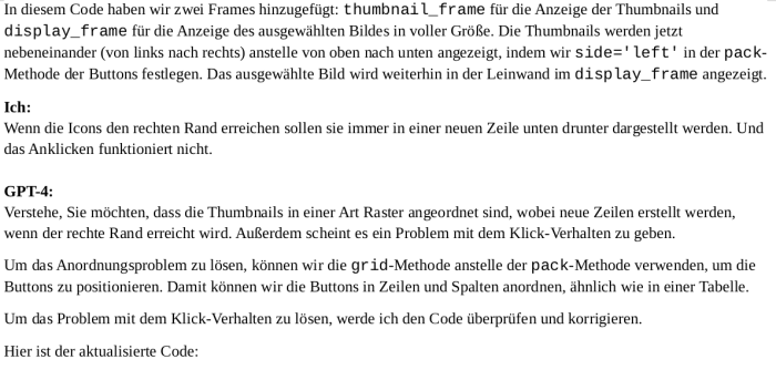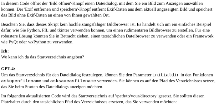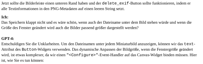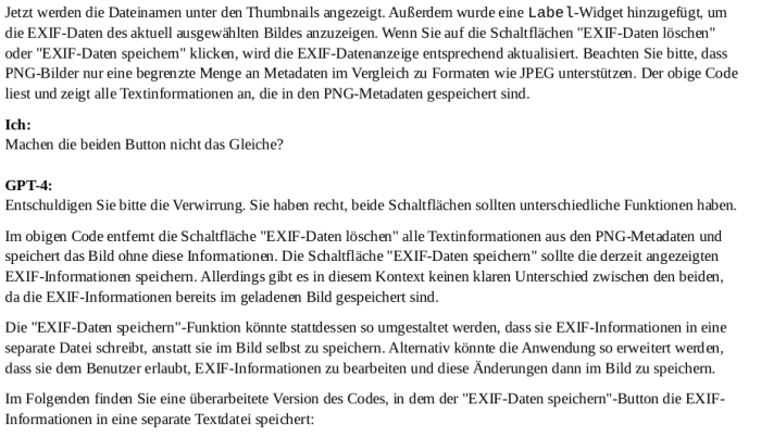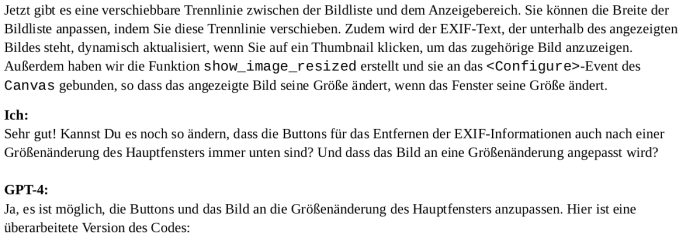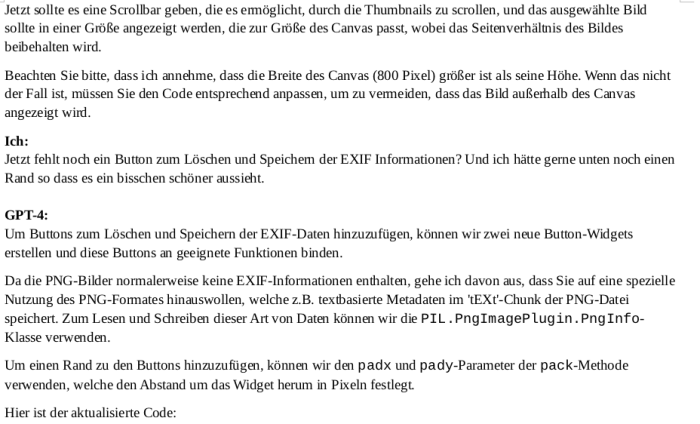 Ich öffnete also einen neuen Chat und wählte das GPT-4-Modell aus. Was ich genau schrieb und welche Antworten ich bekam, kann auf den folgenden Seiten im kompletten Chat-Verlauf nachgelesen werden. Der letzte dort gezeigte Code ist ein funktionierender Bildbrowser, der die Bilder eines beim Aufruf anzugebenden Verzeichnisses auf der linken Seite in vier Spalten zeigt. Es erlaubt, ein Bild anzuklicken, und zeigt es dann auf der rechten Seite groß mit seinen EXIF-Daten.